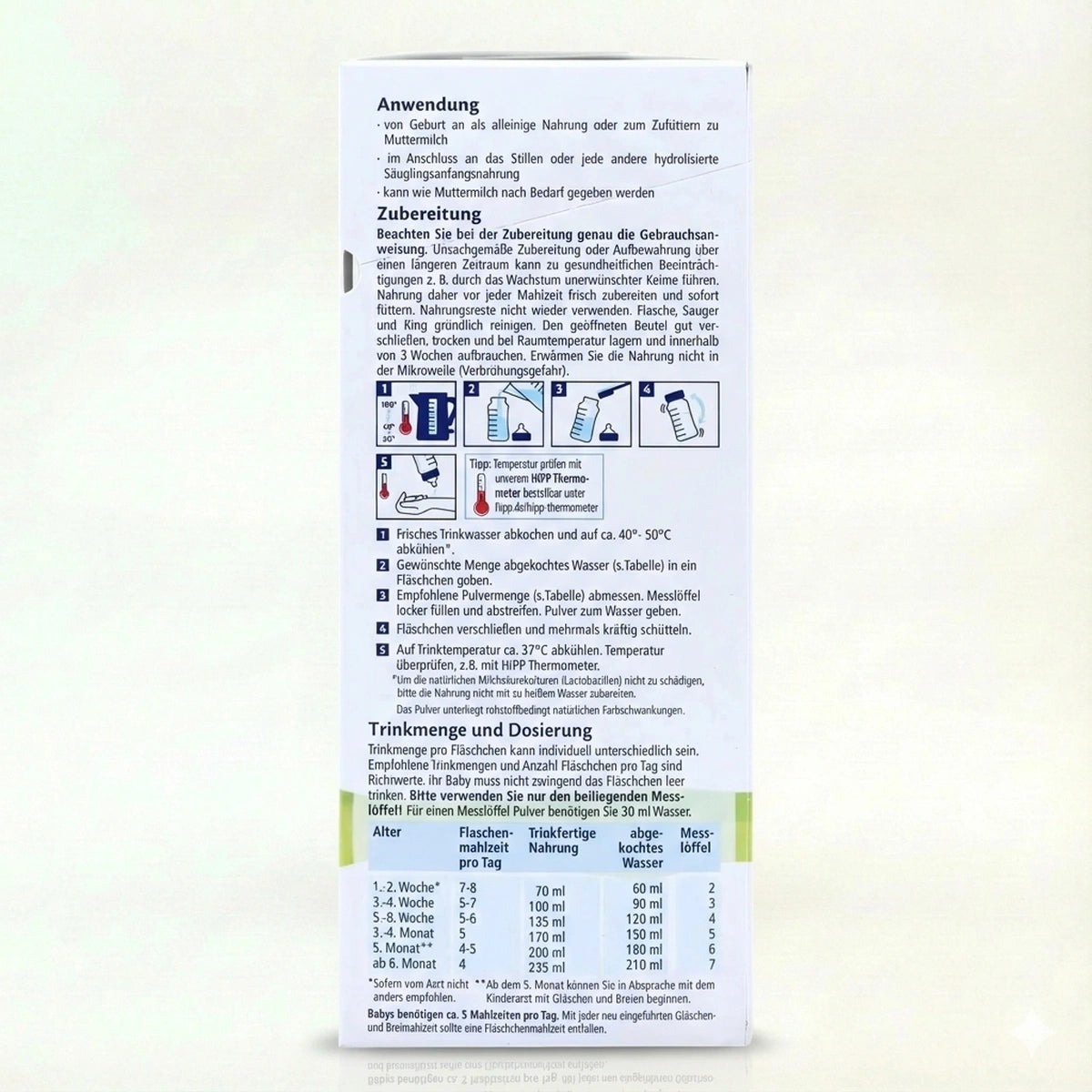 The amount of formula needed per month depends on your baby's eating habits, and whether or not formula is their primary source of food. Below you'll find a sample table for ages 0 - 12+ months based on a 600 g package of HiPP HA Stage PRE formula.